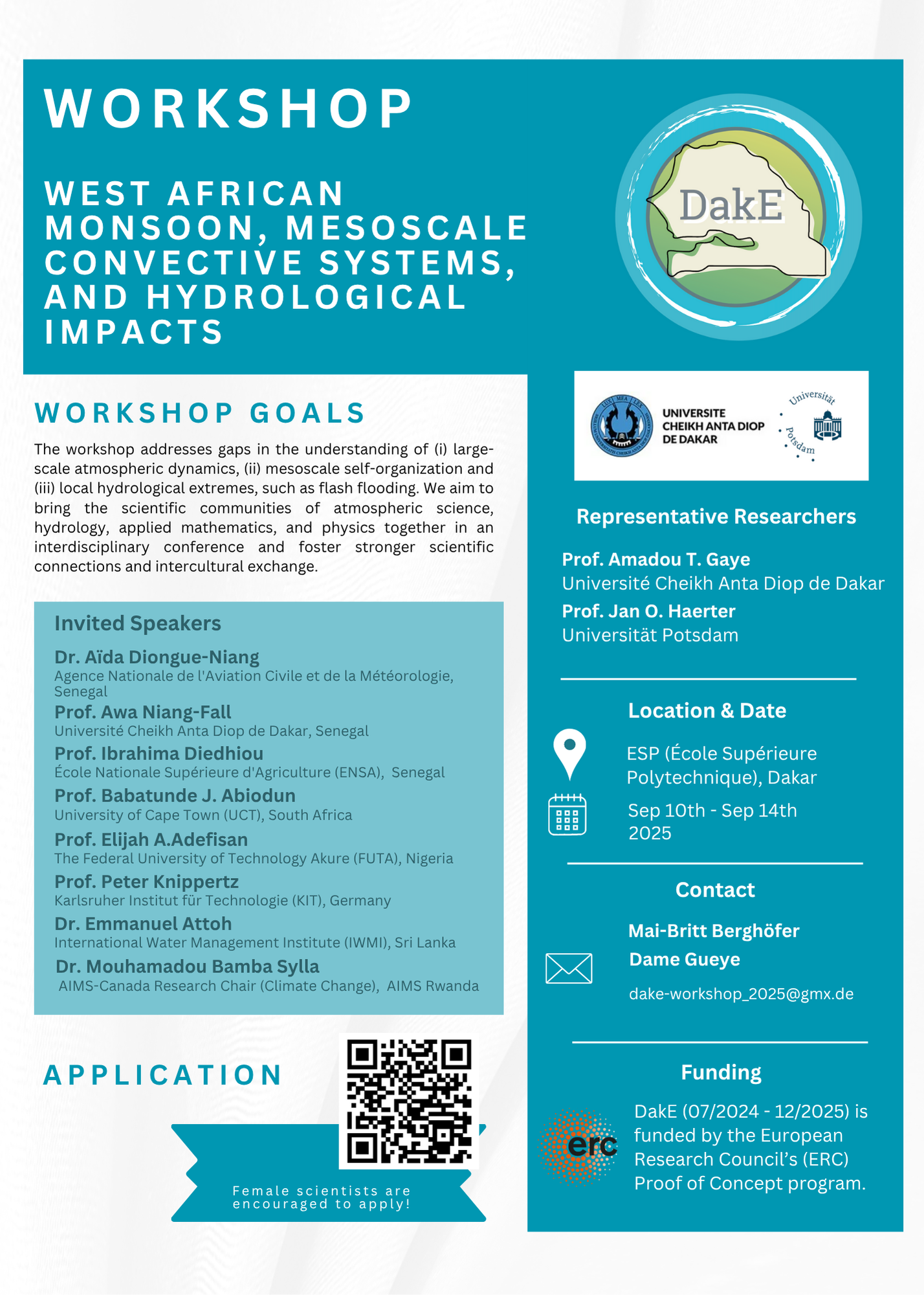 As part of the Dake project, a workshop was organized, consisting of sessions on the following topics: the West African Monsoon and mesoscale convective systems (MCS), regional climate modeling and atmosphere–land–ocean interactions, hydrological extremes and forecasting, as well as the impacts on agriculture.
