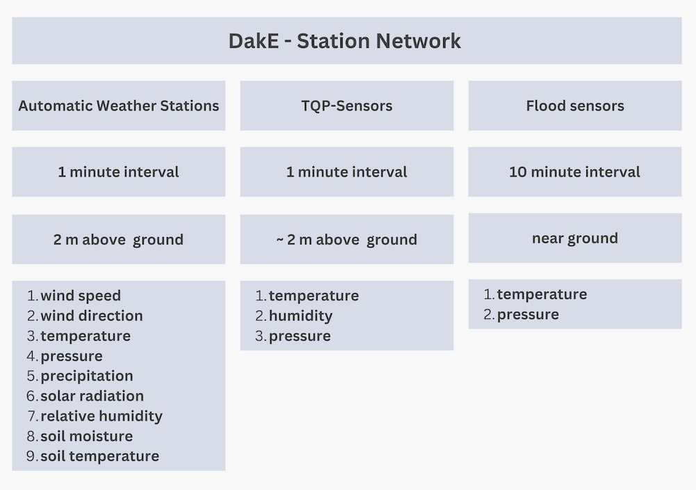 (2) small measurement devices recording temperature, pressure and relative humidity, (3) surface pressure sensors to detect flooding and (4) a number of small soil moisture and temperature gauges. For a detailed description of the DakE-Stationnetwork click here. Select the data preview button below to display the AWS station data.