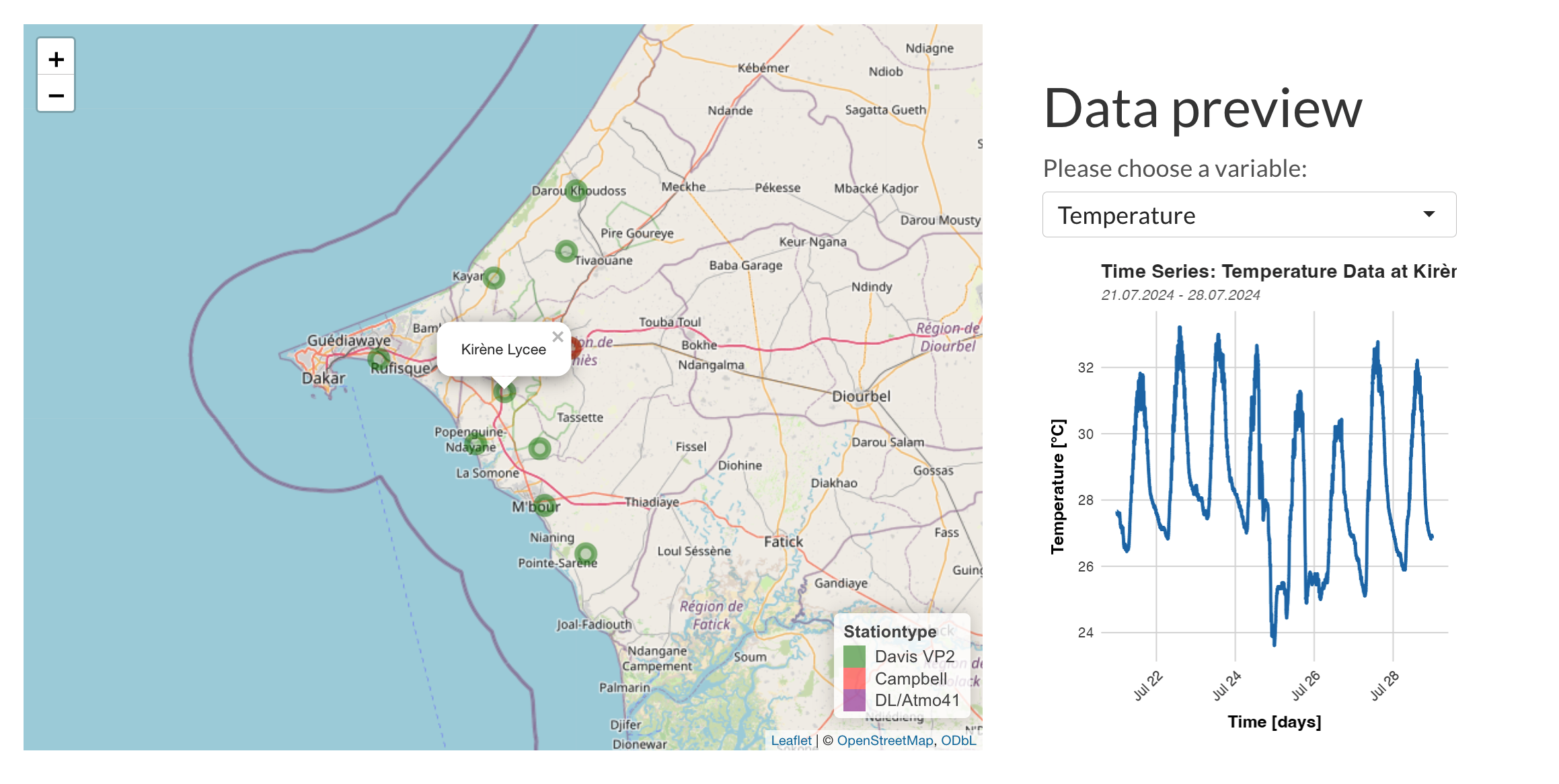 minute temporal resolution, making the data available at near real time at high resolution. Currently, additional seven Campbell-type weather stations are being ordered within DakE and will be deployed in May/June 2025 to increase the existing AWS network to 21 stations. Please select a station on the map and visualize a data preview.